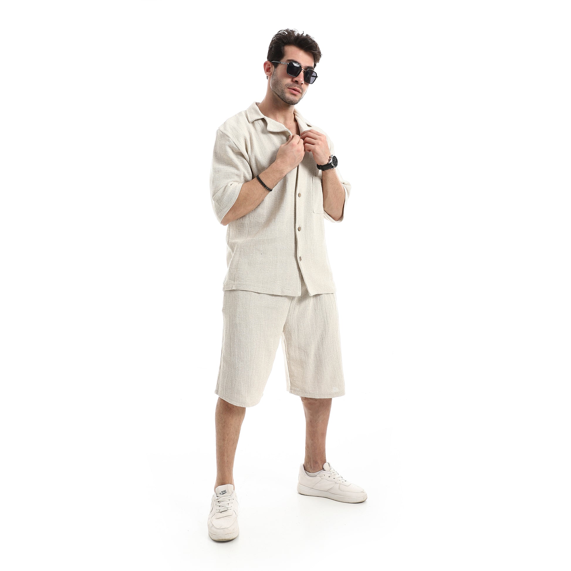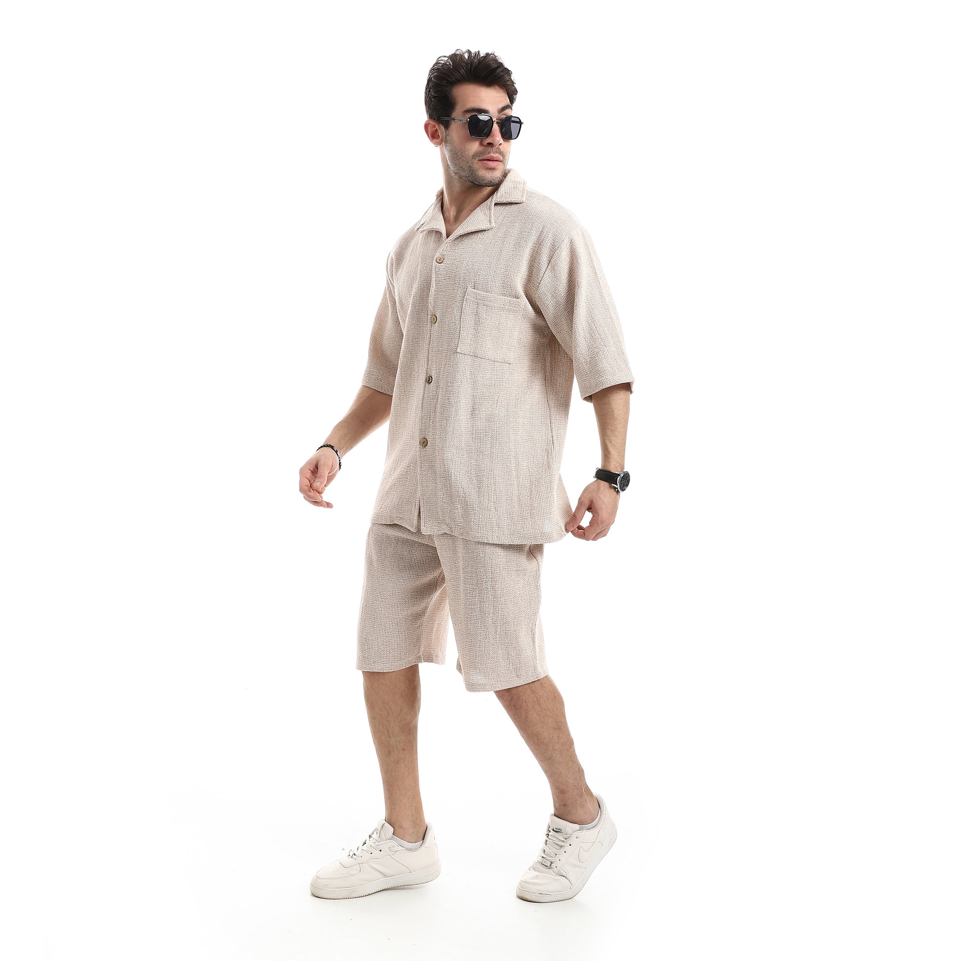 طقم شورت مريح بياقة مطوية وجيوب مائلة